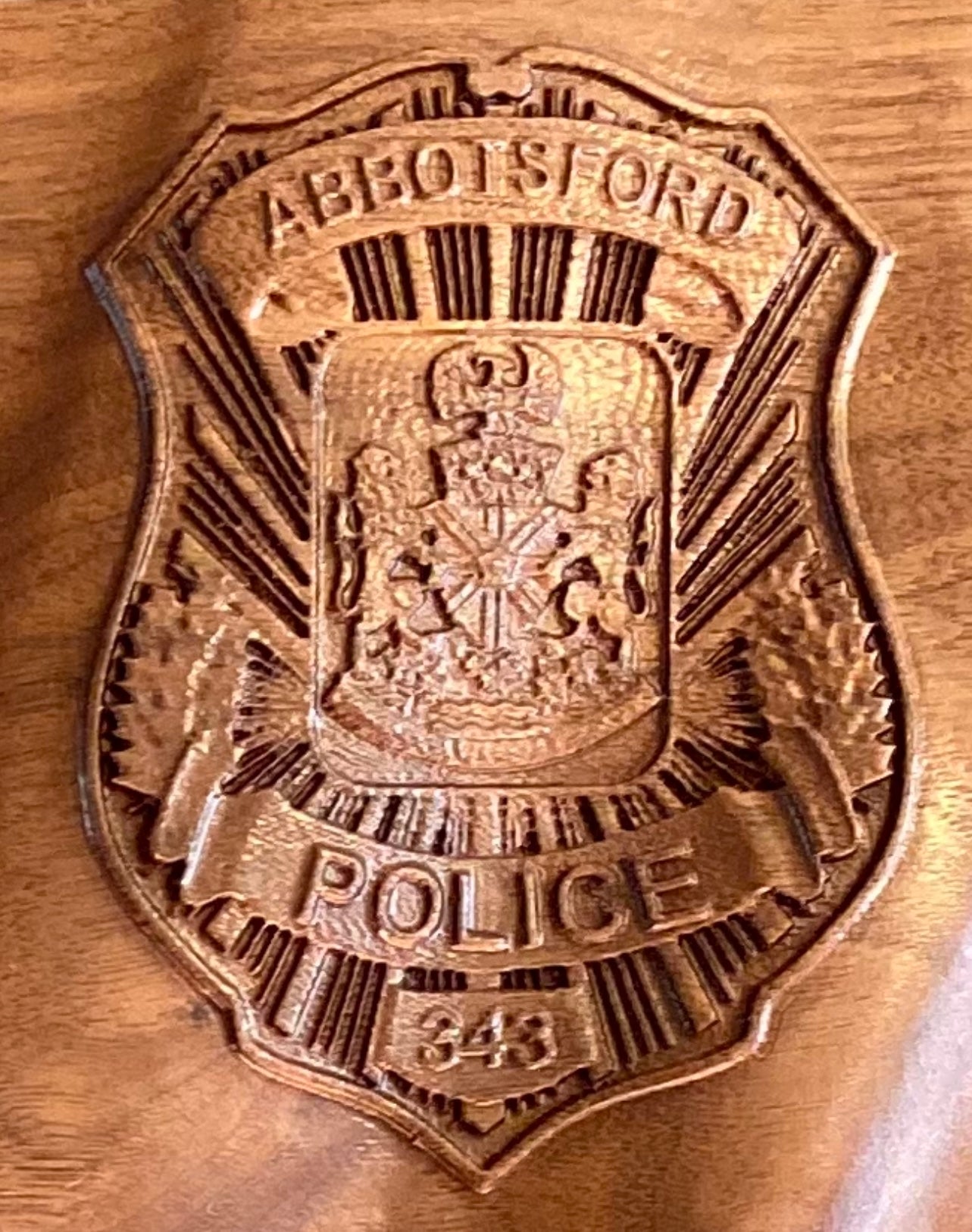 Custom carved Abbotsford Police wooden badges made to order.