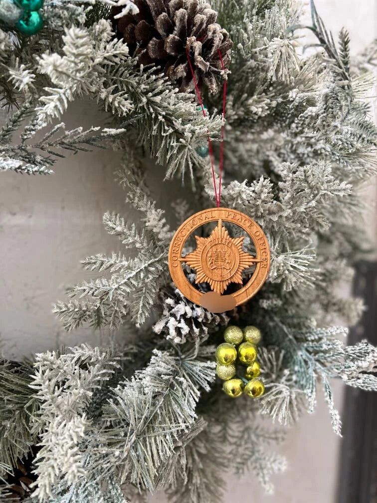 These are Christmas ornaments made from Cherry and Walnut wood for Alberta Corrections Employees. They come with a red string attached for hanging on the tree.
