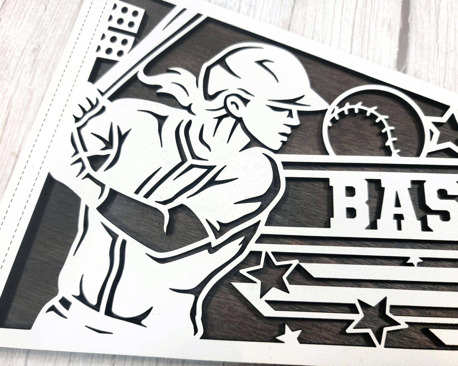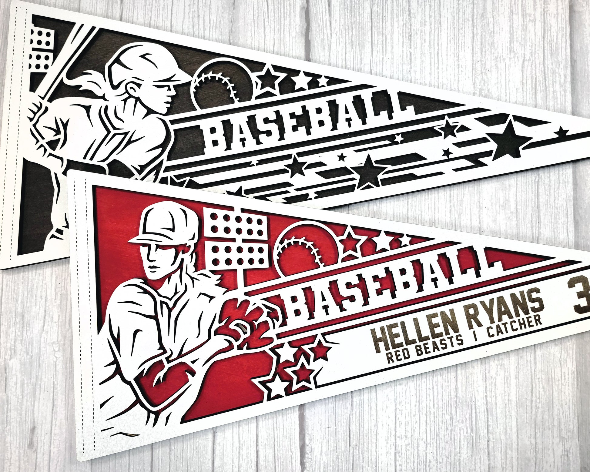 These are two layer Baseball Pennants made with acrylic or wood. There are several colours to choose from. If you want some customization (persons first name, team name, etc), please enter it in the personalization box.