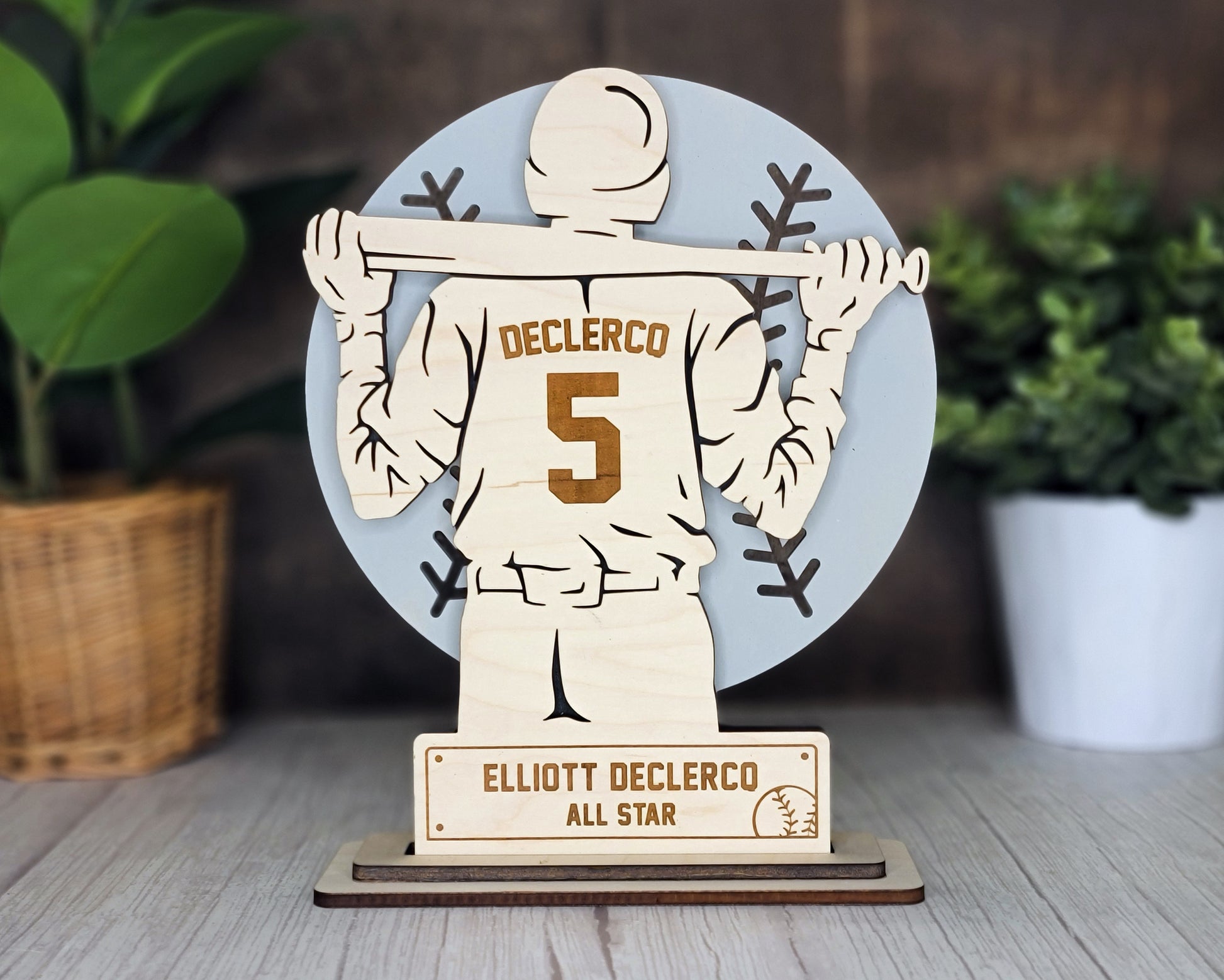 These are two or three layer Baseball Stand-up pieces made with acrylic or wood. There are several colours to choose from. If you want some customization (persons first name, team name, etc), please enter it in the personalization box.