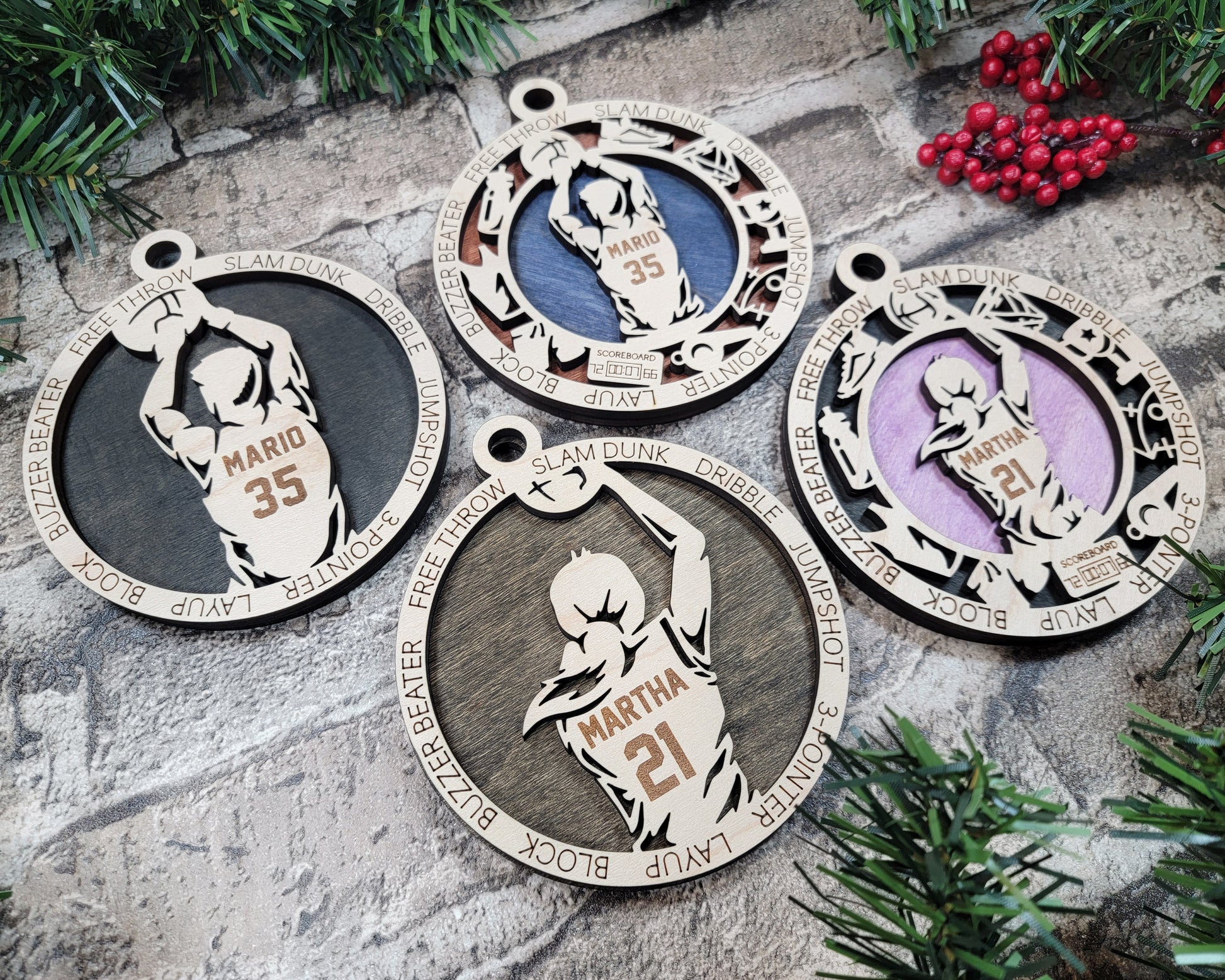 These are two layer Basketball ornaments made with acrylic or wood. There are several colours to choose from. If you want some customization (persons first name, team name, etc), please enter it in the personalization box.