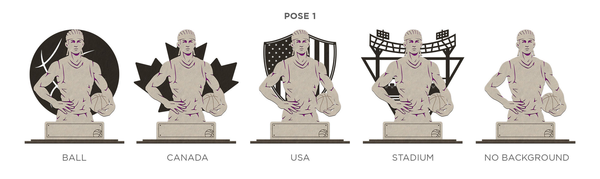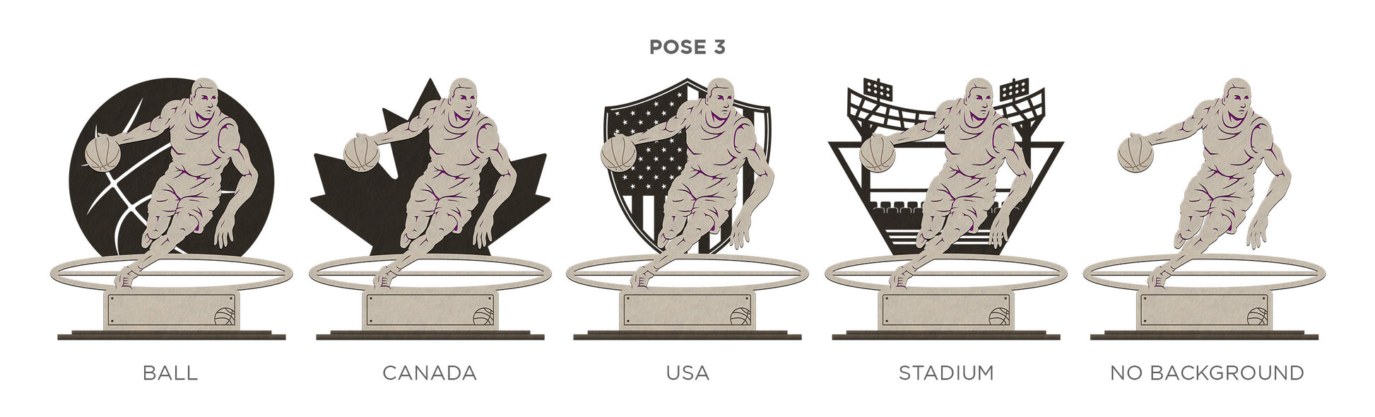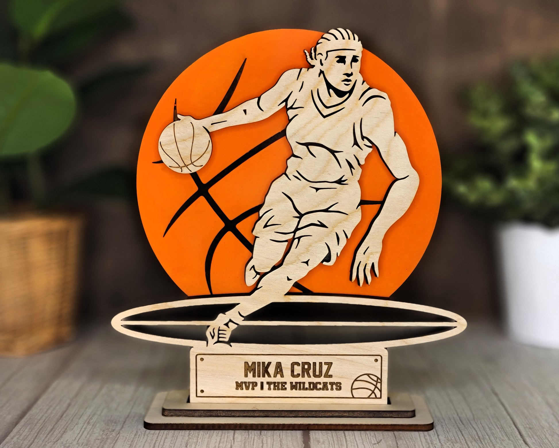 These are two or three layer Basketball Stand-up pieces made with acrylic or wood. There are several colours to choose from. If you want some customization (persons first name, team name, etc), please enter it in the personalization box.
