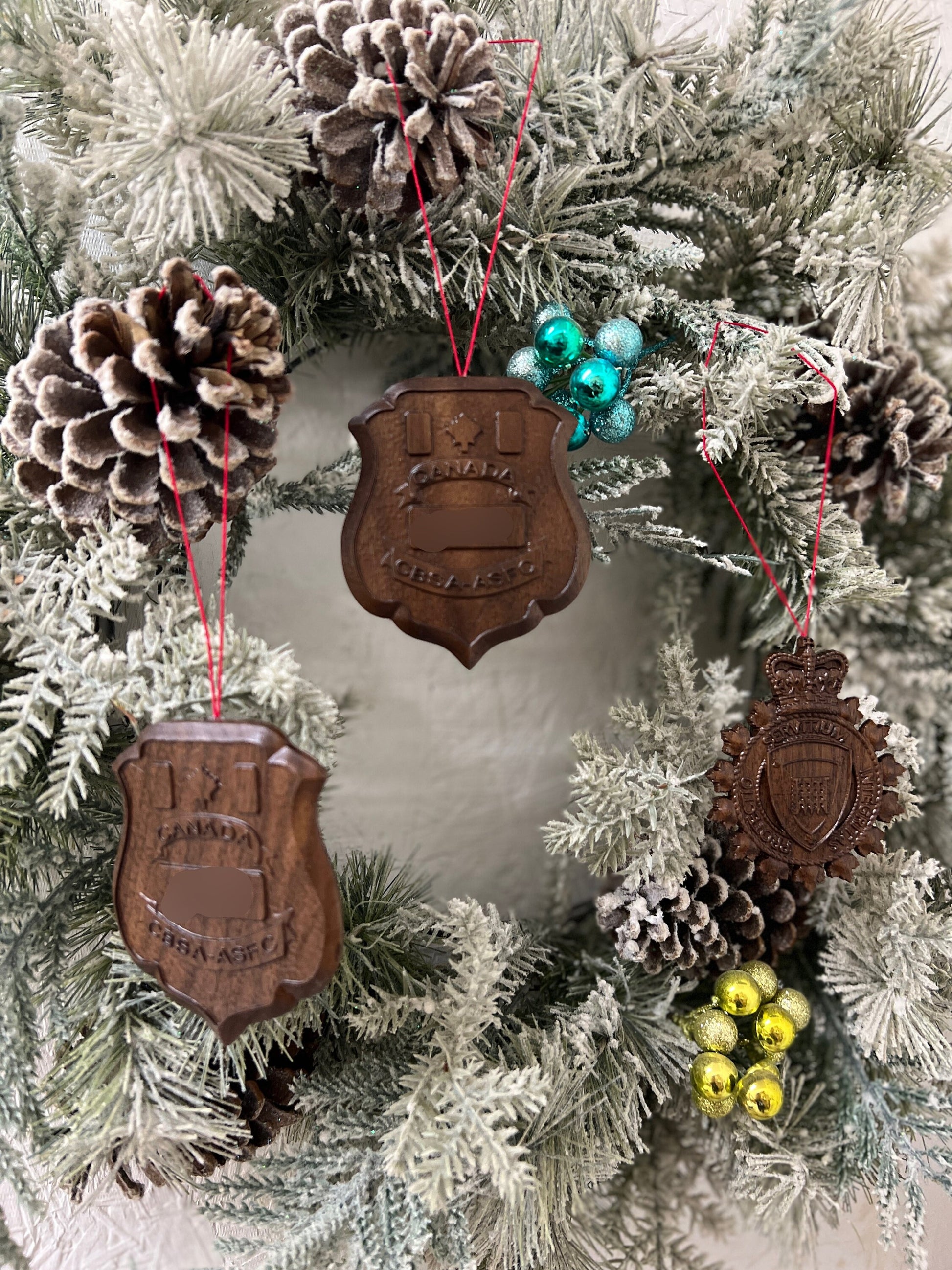 These are Canadian Border Service Agency (CBSA) Christmas ornaments made from Cherry and Walnut wood. They come with a red string attached for hanging on the tree.
