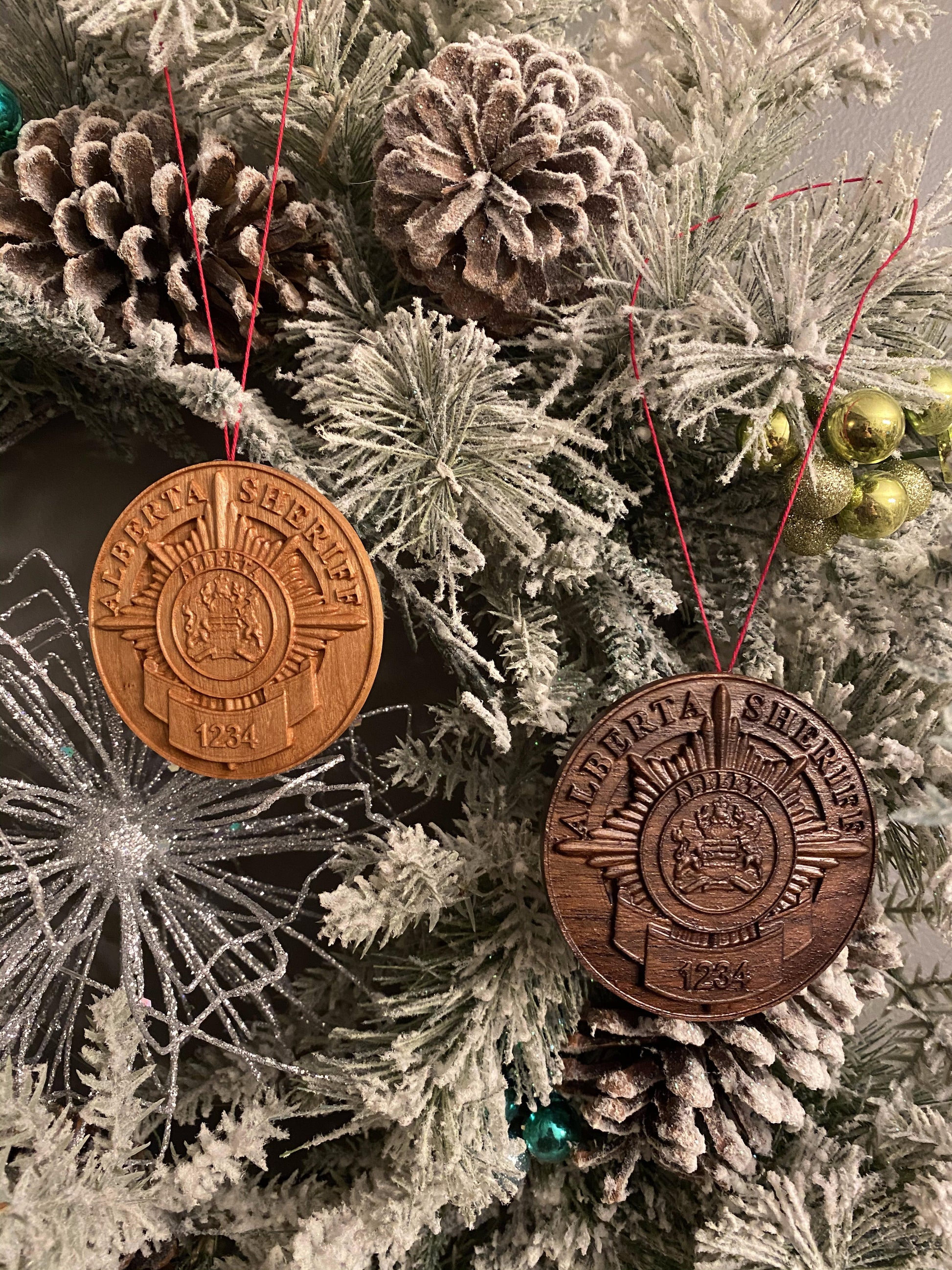 These are Christmas ornaments made from Cherry and Walnut wood for Alberta Sheriff members. They come with a red string attached for hanging on the tree.