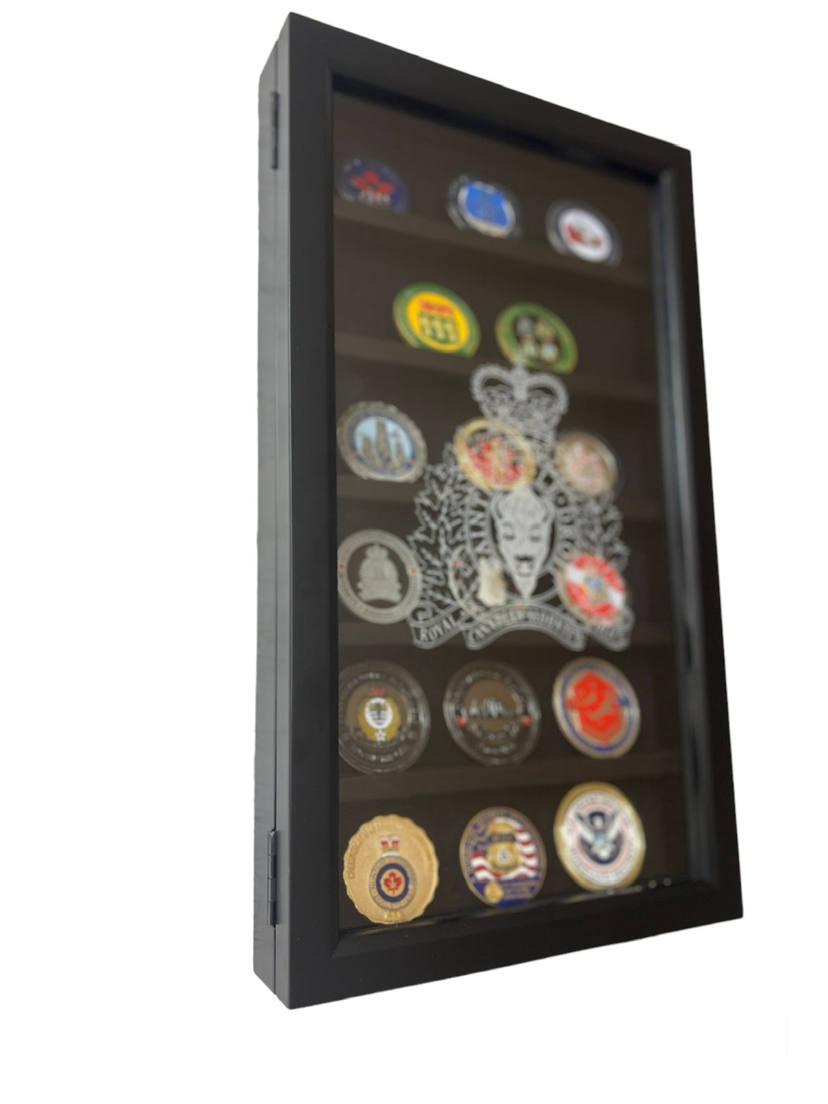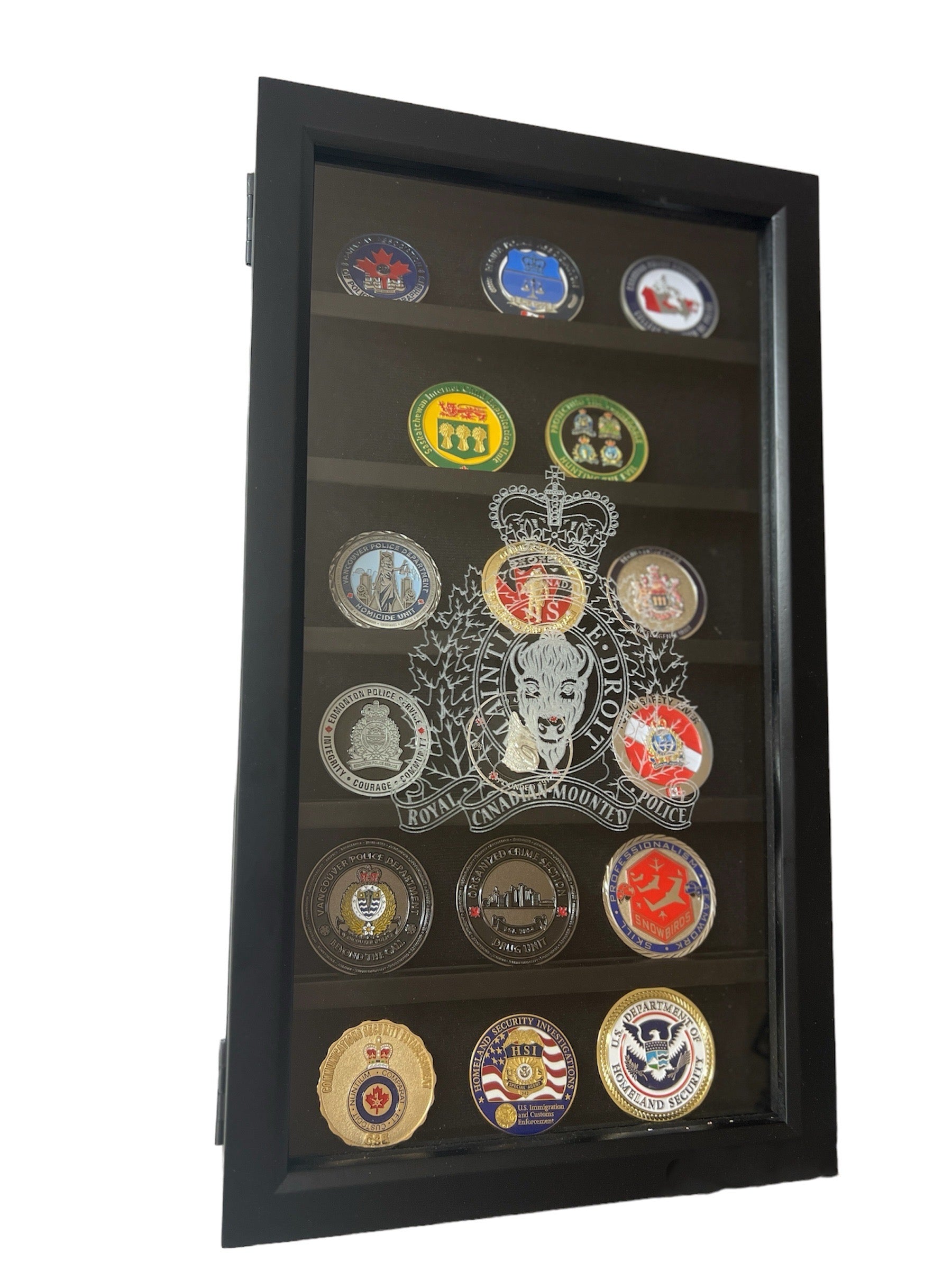 It has 6 shelves that can hold 24 standard sized coins. It comes with sawtooth hangers on the back. Dimensions are 8in by 15in.