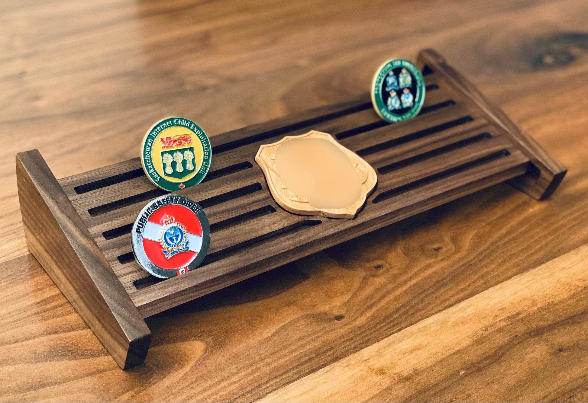 This is a desktop display for challenge coins. It comes with a customized badge/crest. Board is approx 12” wide by 4” tall and holds approximately 20-24 coins.