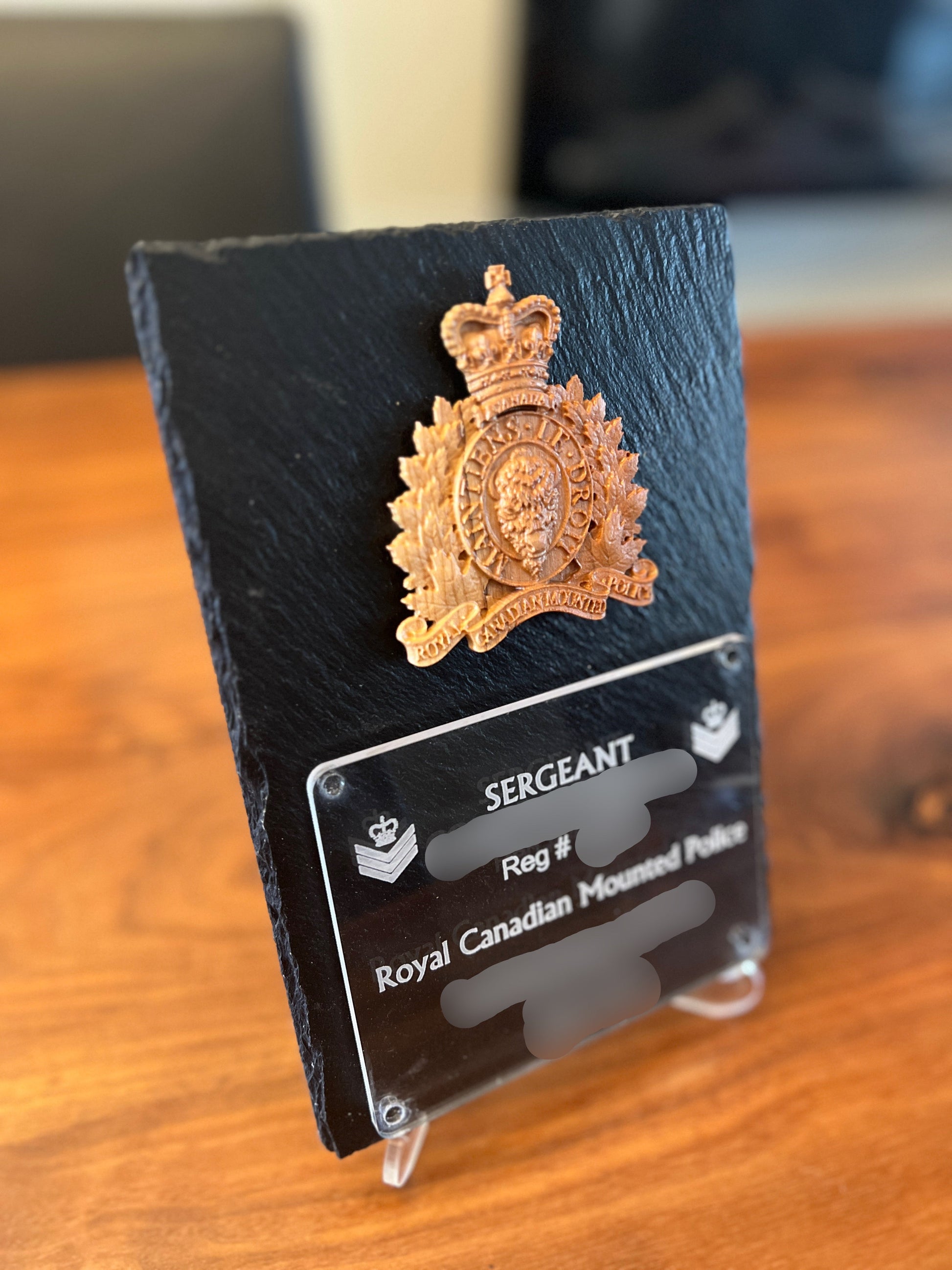 These are slate award plaques made with slate, clear acrylic and wood. The plaque sits on an acrylic stand. You can choose whether you want a crest or a badge. The wooden component is approximately 3".