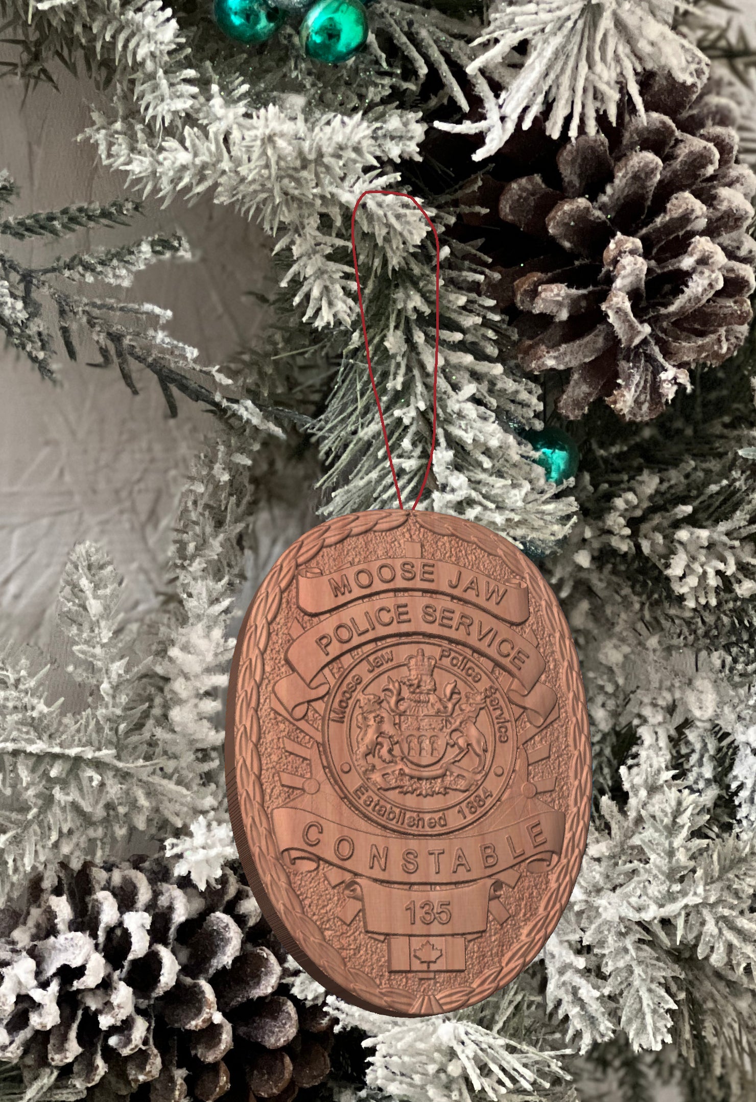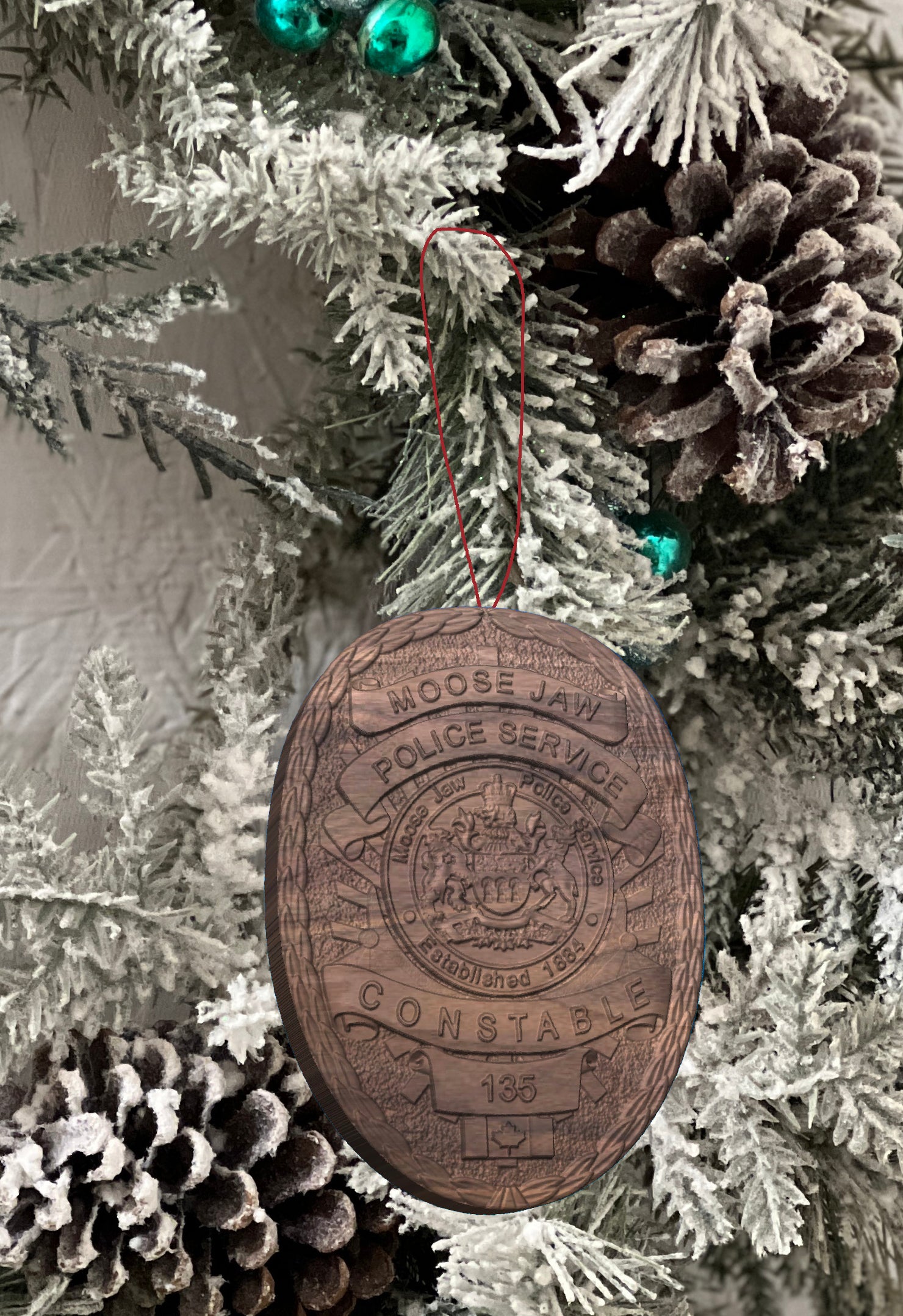 These are Moose Jaw Police Christmas ornaments made from Cherry and Walnut wood. They come with a red string attached for hanging on the tree.