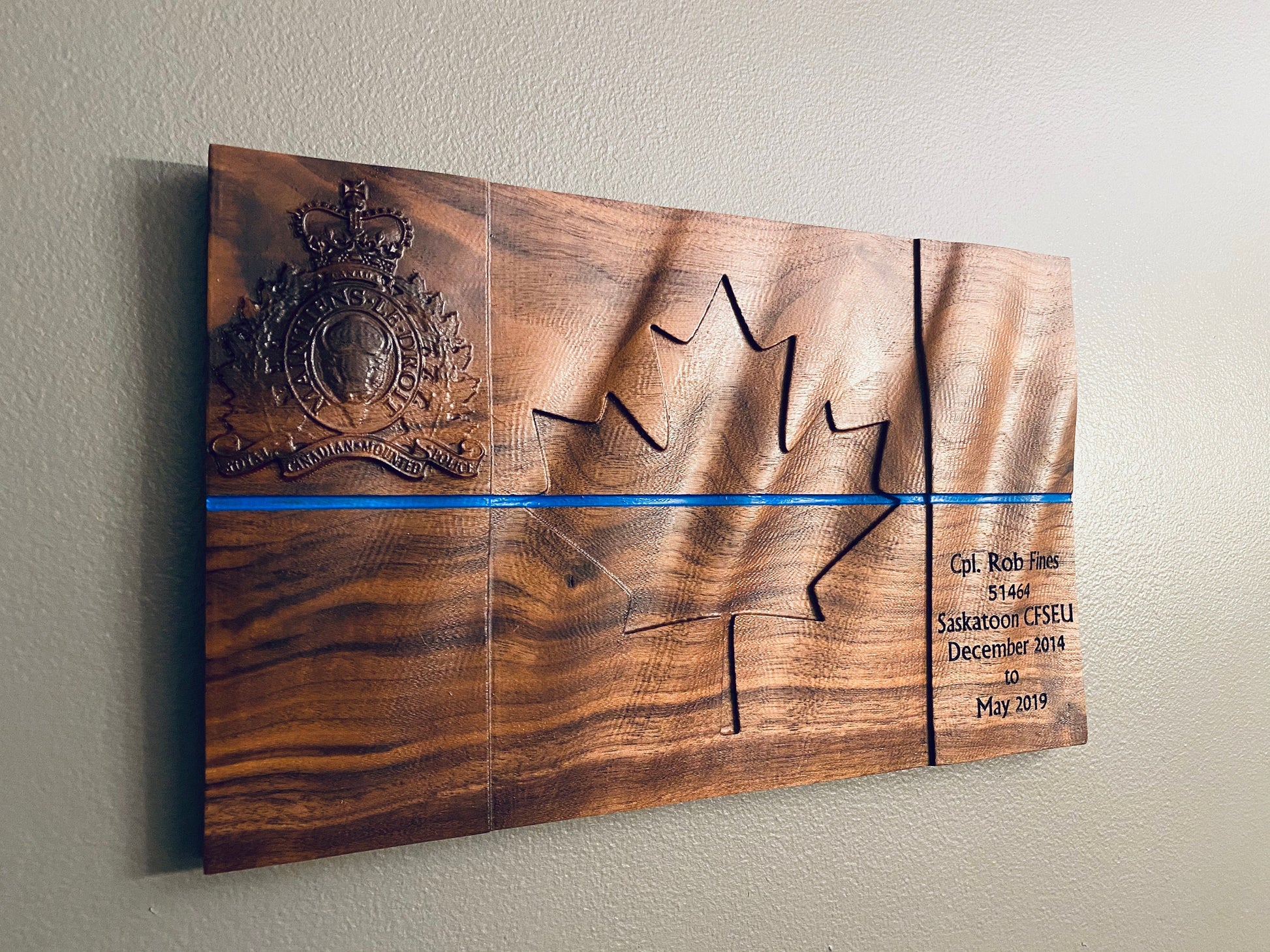 The flag is 3D carved and a thin blue line is painted in the middle.