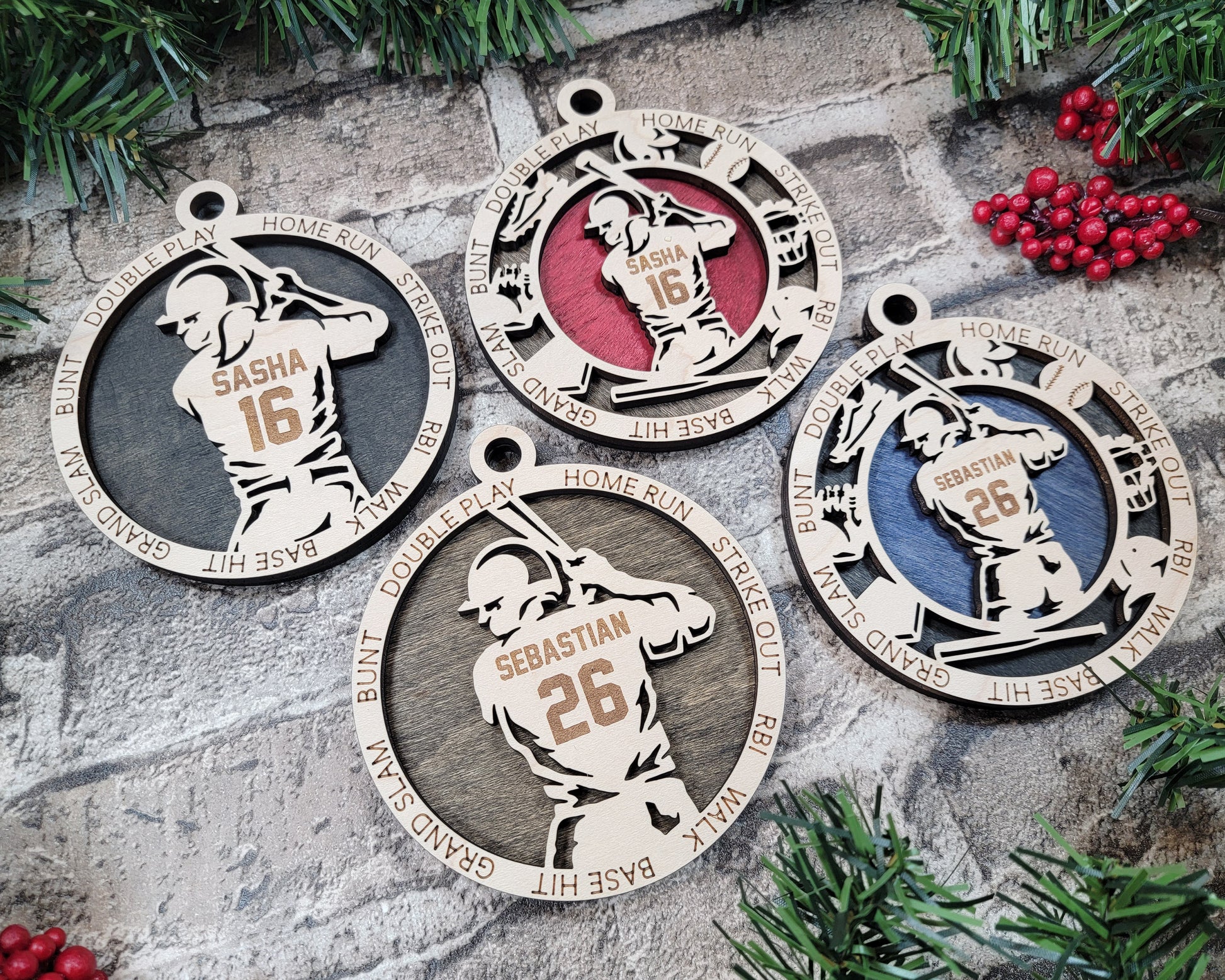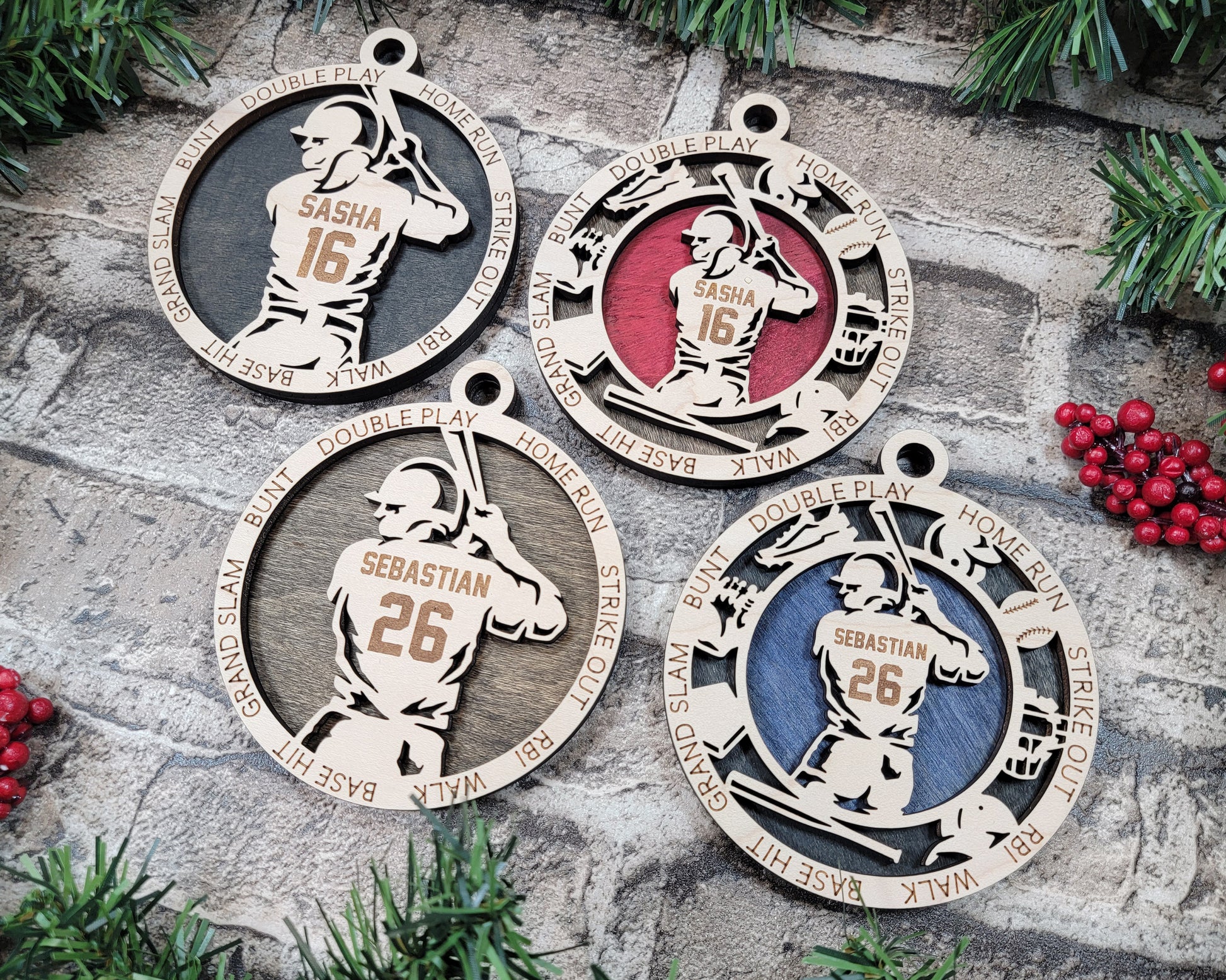 These are two layer Baseball ornaments made with acrylic or wood. There are several colours to choose from. If you want some customization (persons first name, team name, etc), please enter it in the personalization box.