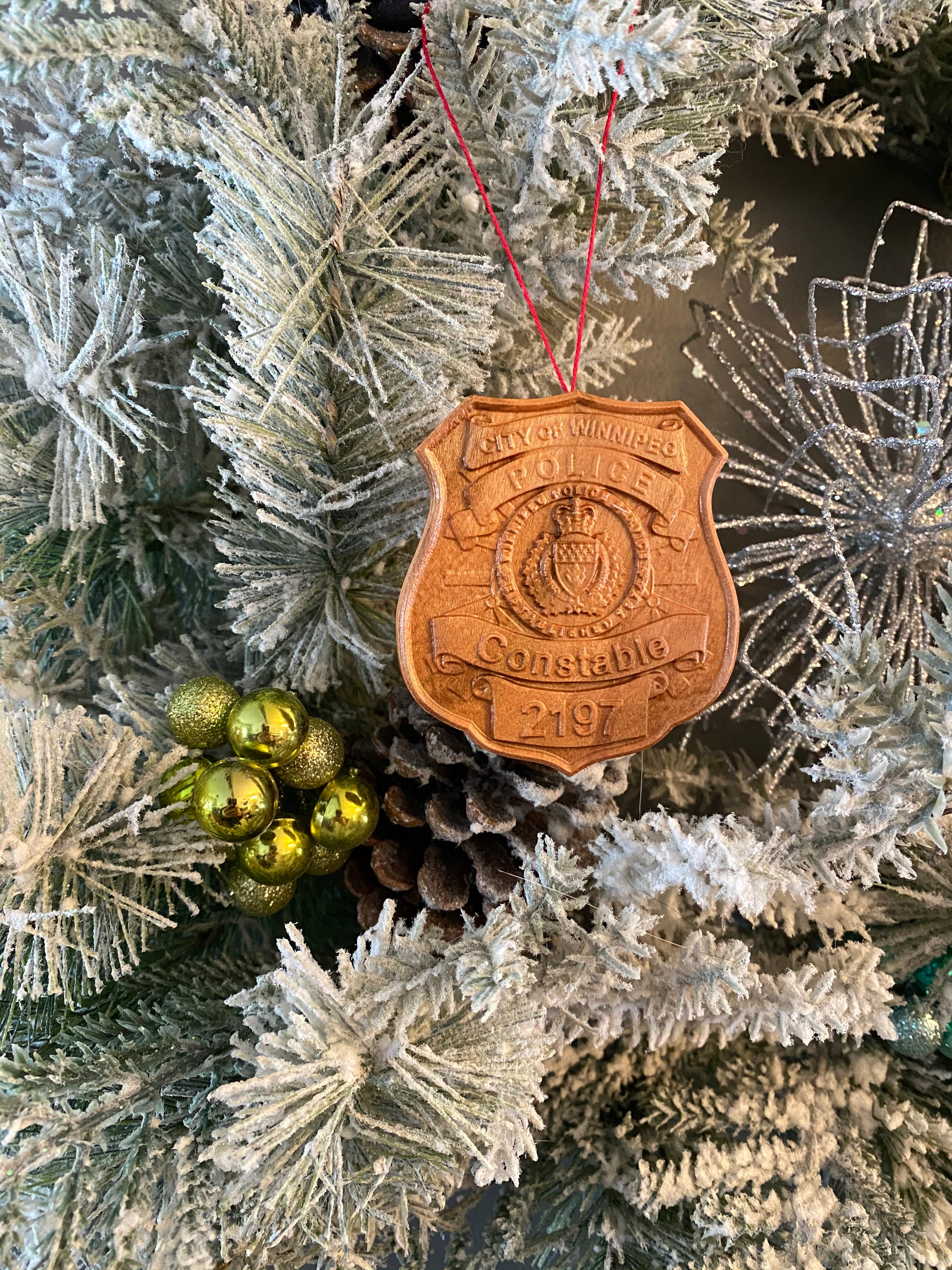 These are Winnipeg Police Christmas ornaments made from Cherry and Walnut wood. They come with a red string attached for hanging on the tree.