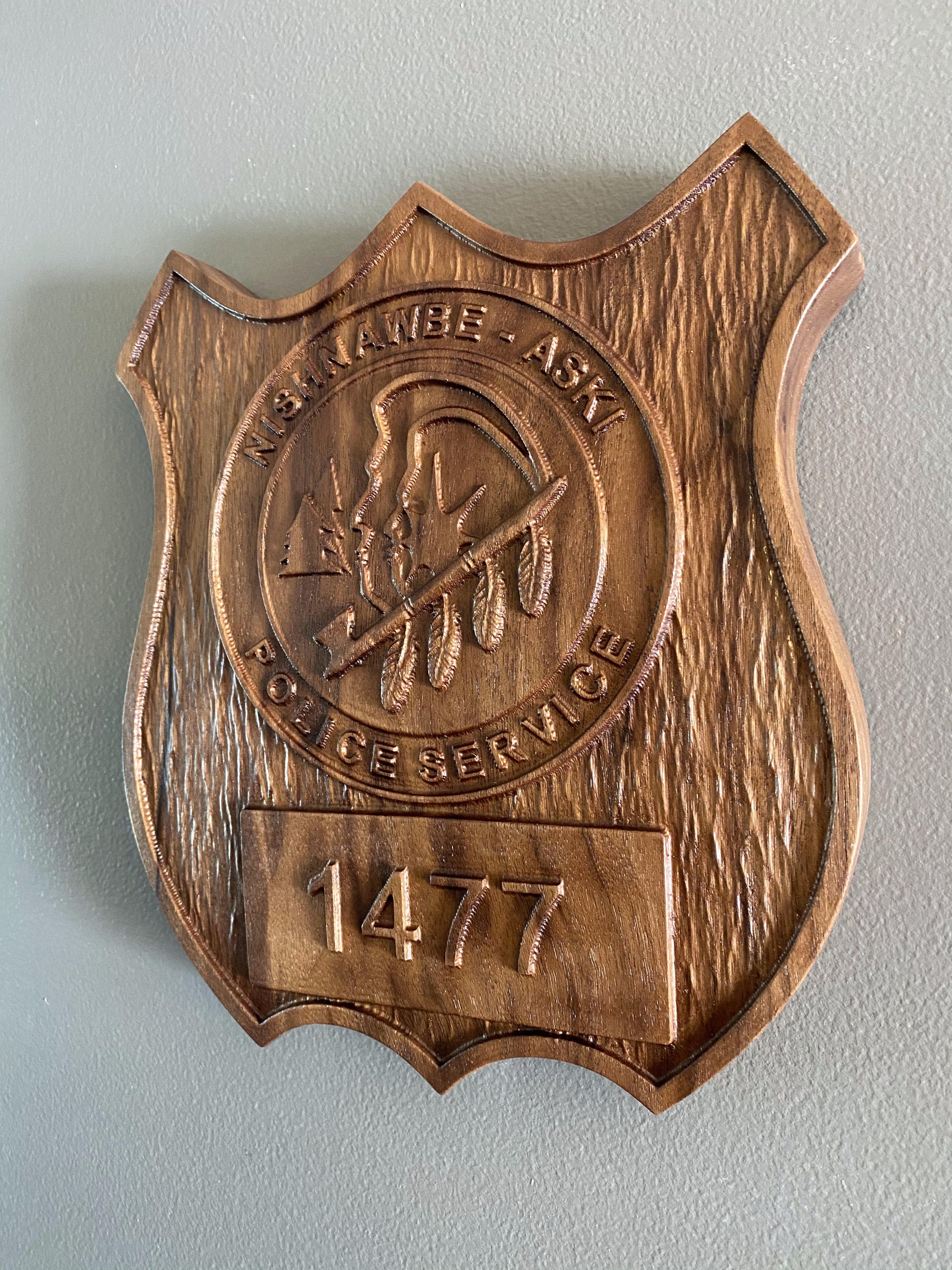 Custom carved Nishnawbe-Aski Police wooden badges made to order.