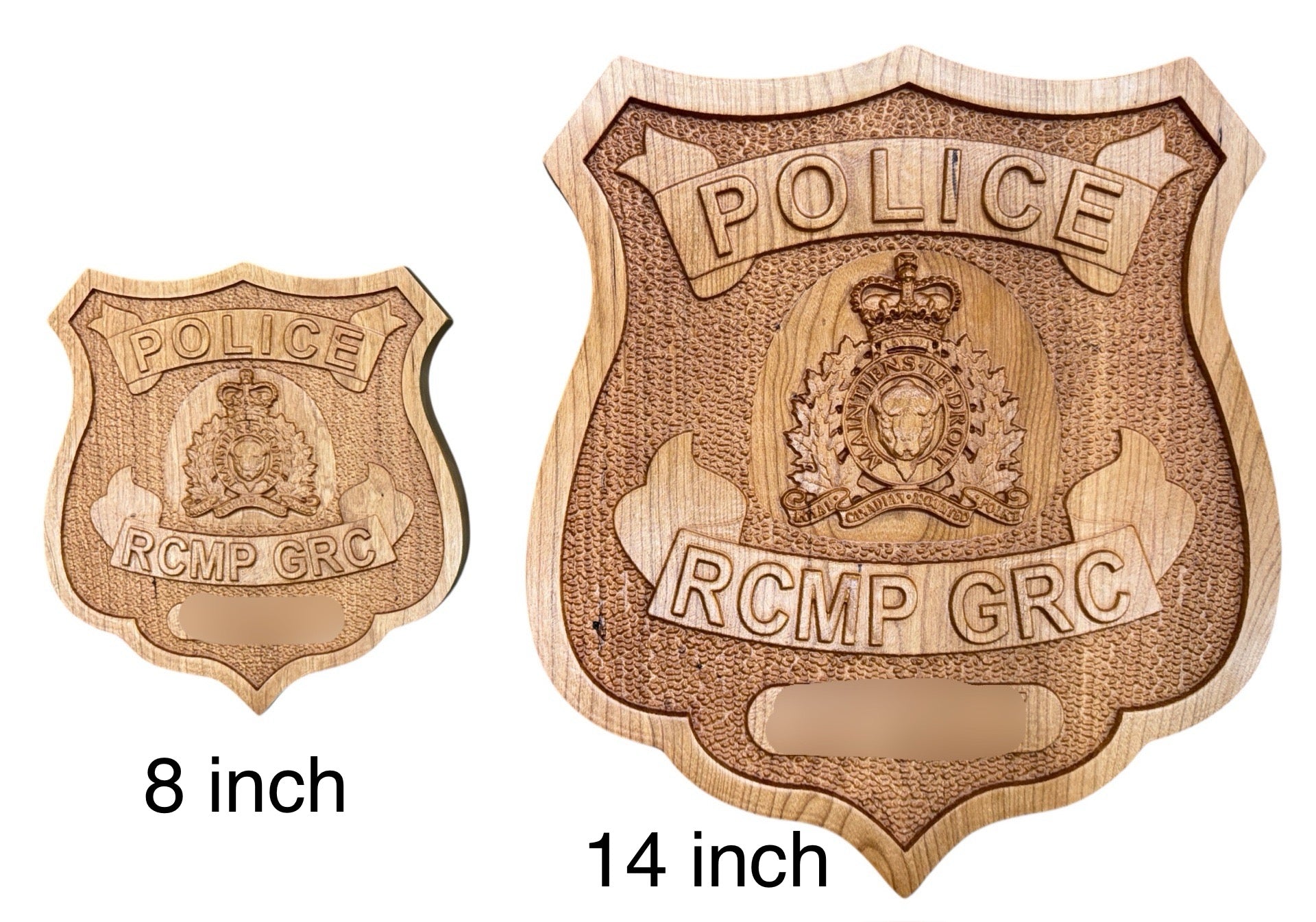 Custom carved RCMP wooden badges made to order. They make great police gifts, graduation gifts, Christmas gifts, retirement gifts and even transfer gifts.